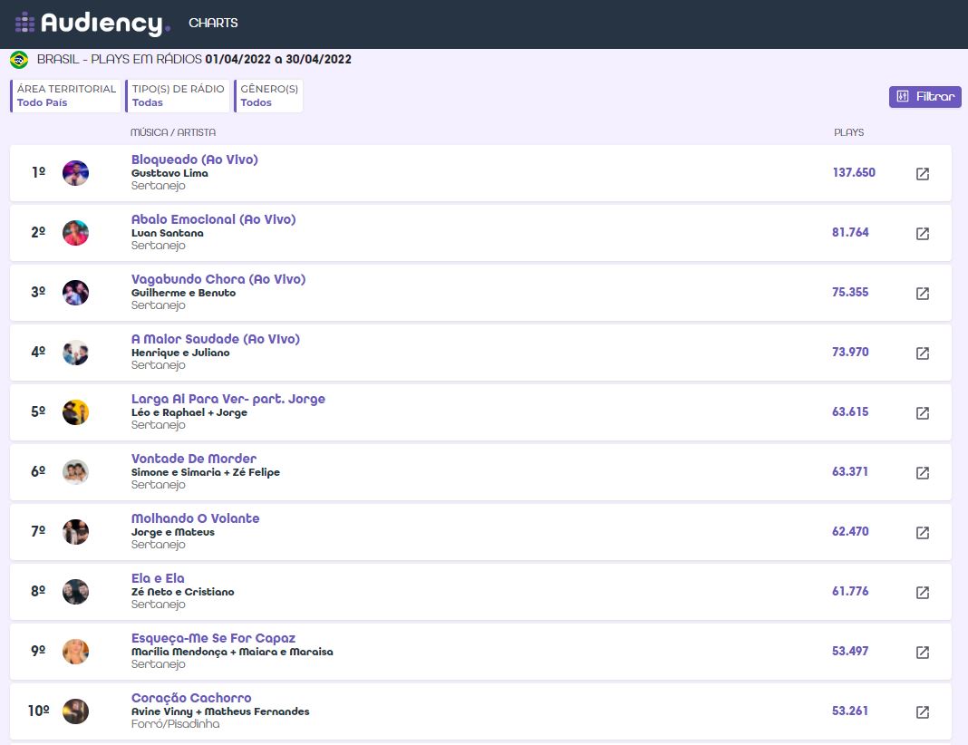 Passou Páscoa, Carnaval, feriados e o mês de abril vai ficando para trás. Contudo, algumas coisas permanecem incontestáveis. Por exemplo, o cantor Gusttavo Lima se consolida com folga como o mais tocado nas rádios do país, mesmo considerando todos os gêneros. Seu sucesso “Bloqueado” mantém a liderança com 137.650 plays.