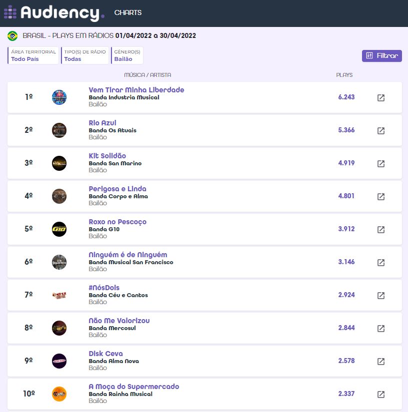 Quando o ritmo é bailão, a Banda Indústria Musical desponta em primeiro lugar, com o sucesso “Vem Tirar Minha Liberdade”, com 5.444 plays, um avanço e tanto, visto que no mês anterior a banda estava em sexto lugar.
