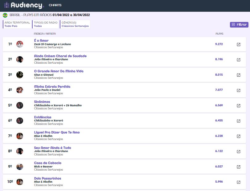 O gênero clássico sertanejo mostra uma certa constância na preferência da população. A mais tocada do mês foi o hit de Zezé de Camargo e Luciano “É o Amor”, com 9.272 plays.