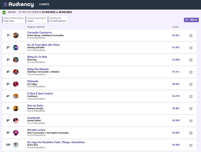 Mantendo o desempenho do primeiro trimestre, a parceria Avine Vinny e Matheus Fernandes segue na dianteira entre as mais tocadas no ranking de abril, com 53.261 execuções de “Coração Cachorro”.
