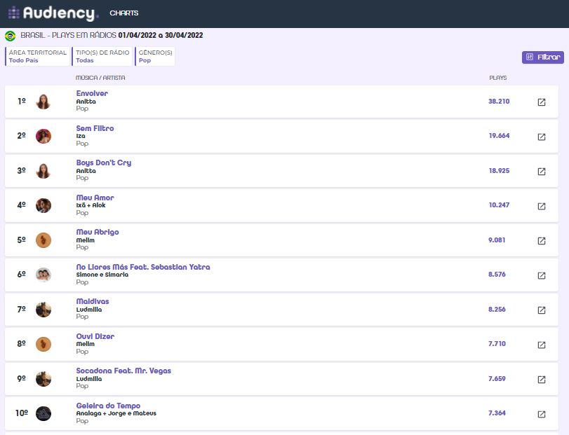 O fenômeno Anitta fortalece mais e mais sua posição junto ao público. Além do hit “Envolver”, primeiro lugar absoluto no mês de abril, com 38.210 plays, a cantora emplacou também o terceiro lugar, com “Boys Don’t Cry”, tocada 18.925 vezes.