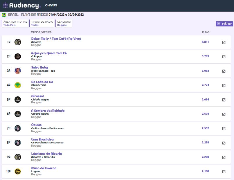 No mês de abril, a banda paulista Maneva manteve a liderança entre as mais tocadas no gênero reggae, com o sucesso “Deixe-me Ir|Tem Café”, com 8.811 com a plays.
