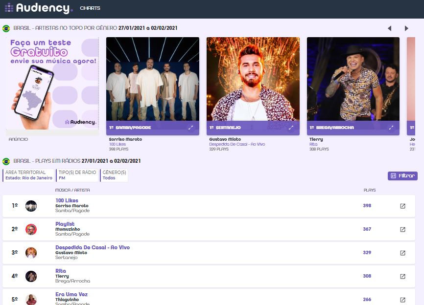 Quer conher as 100 mais tocas nas emissoras de rádio AM, FM, Comunitária e Web? Então acesse o charts musical Audiency.