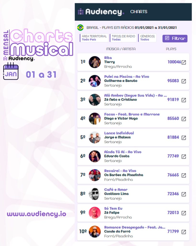 O cantor e compositor Tierry começou o ano com o pé direito! Fechou o mês de janeiro/2021 em primeiro lugar com a música “Rita” com 100.046 execuções segundo o filtro no Charts Musical da Audiency, música+artista, seleção Brasil, de 01 a 31 de janeiro.